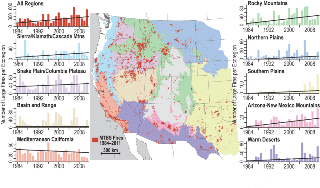 Rising global temperatures make for drier, more flammable environments. Less snowpack in the mountains leads to less moisture in the valley floors during fire season. Someone doesn’t put out their campfire (84% of wildfires are started by humans), and because the vegetation is so parched, it goes up in flames easier, spreads quicker, and is harder to contain.